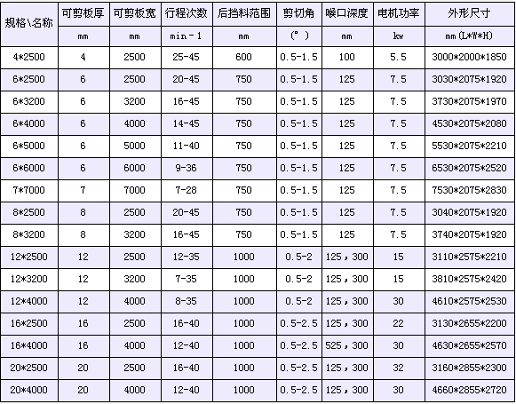 性能與特點: 全鋼焊接結構,綜合處理(振動時效、熱處理)消除內應力,有很好的鋼性與穩定性;采用先進的集成式液壓系統,可靠性好; 采用三點式滾動導軌,消除導軌間隙,提高剪切質量;機動后擋料,手動微調,數字顯示; 刀片間隙有手輪調整,迅速,準確,方便; 矩形刀片,四個刃口均可使用,使用壽命長,剪切角可調,減少板料扭曲變形; 上刀架采用內傾結構,便于落料,并提高工作的精度;具有分段剪切功能;具 有燈光照明裝置功能; 后托料裝置(可另選擇配置)。